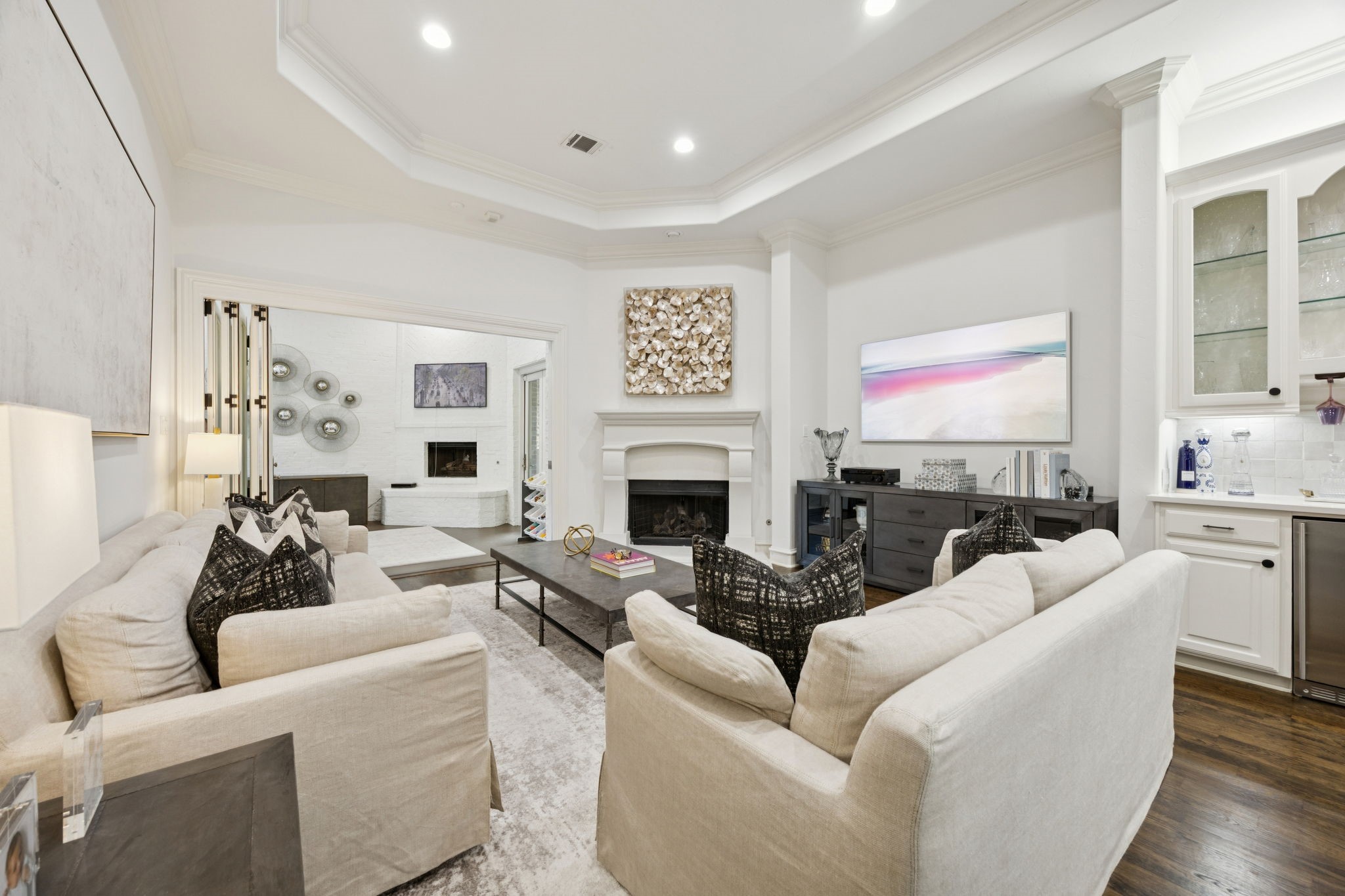 The gourmet kitchen features granite countertops, stainless steel appliances, two pantry areas with lots of storage, and flows seamlessly into the spacious family room where French doors open to an inviting indoor sun porch with a second fireplace which is perfect for entertaining year round and a downstairs second living area. The downstairs also offers a private study with great sunlight.