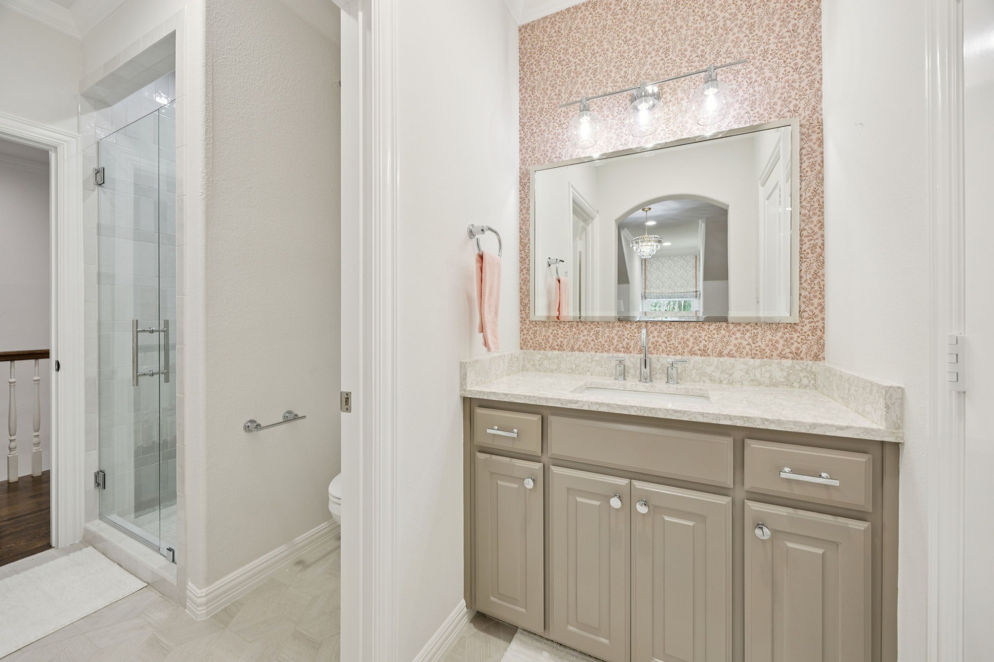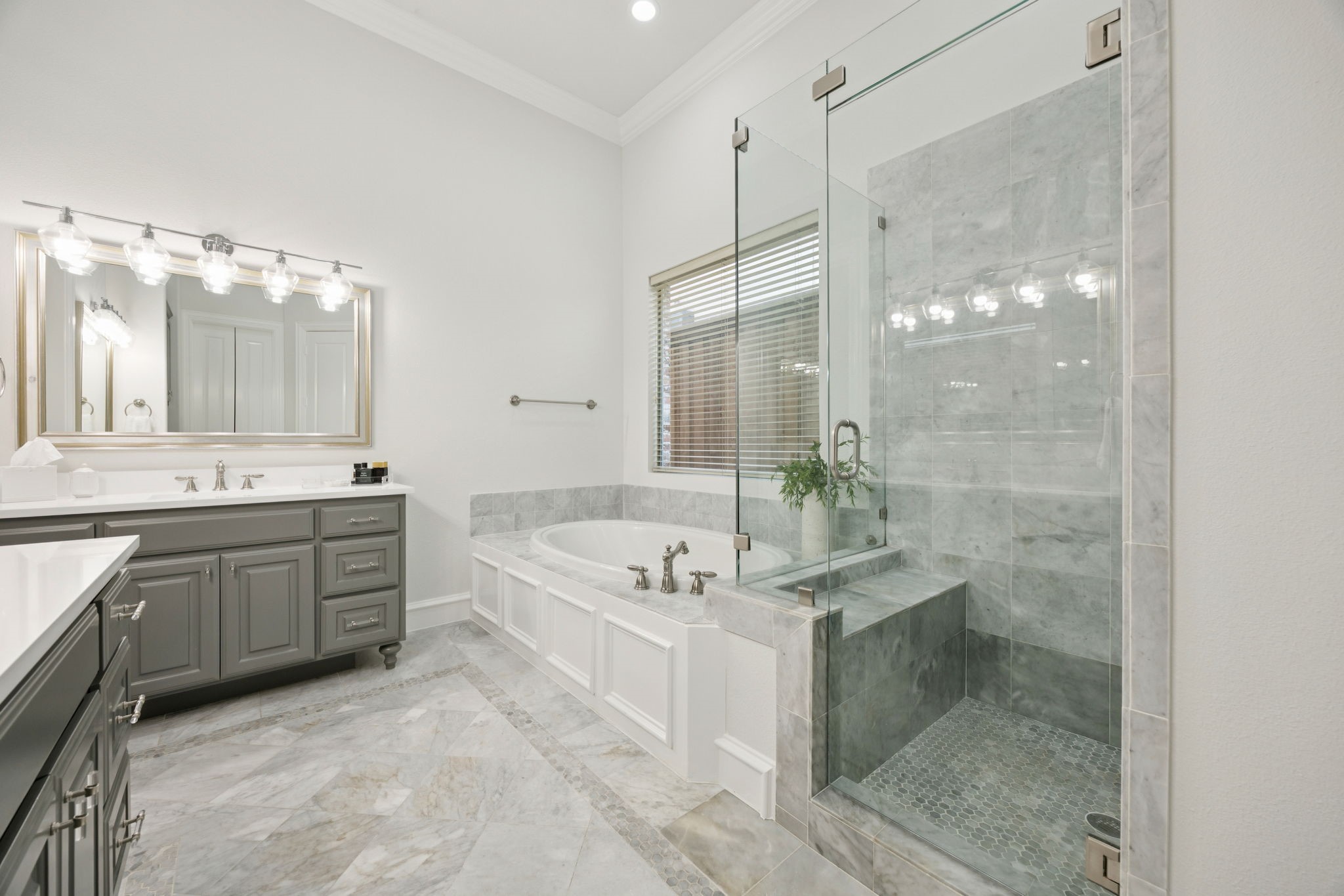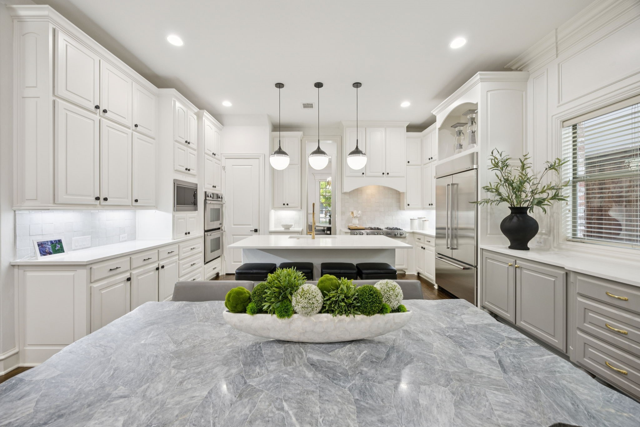 The first floor primary suite offers a serene retreat with a marble bath. Upstairs, you will find three recently updated generously sized ensuite bedrooms, a media room, and a wide central hallway ideal for a study nook or snack station, and a large media game room flex space.