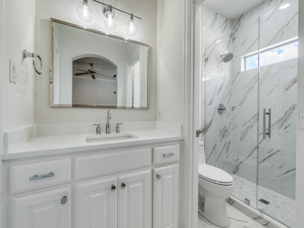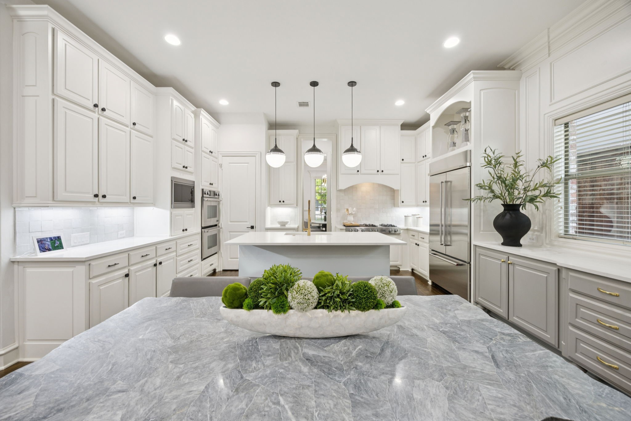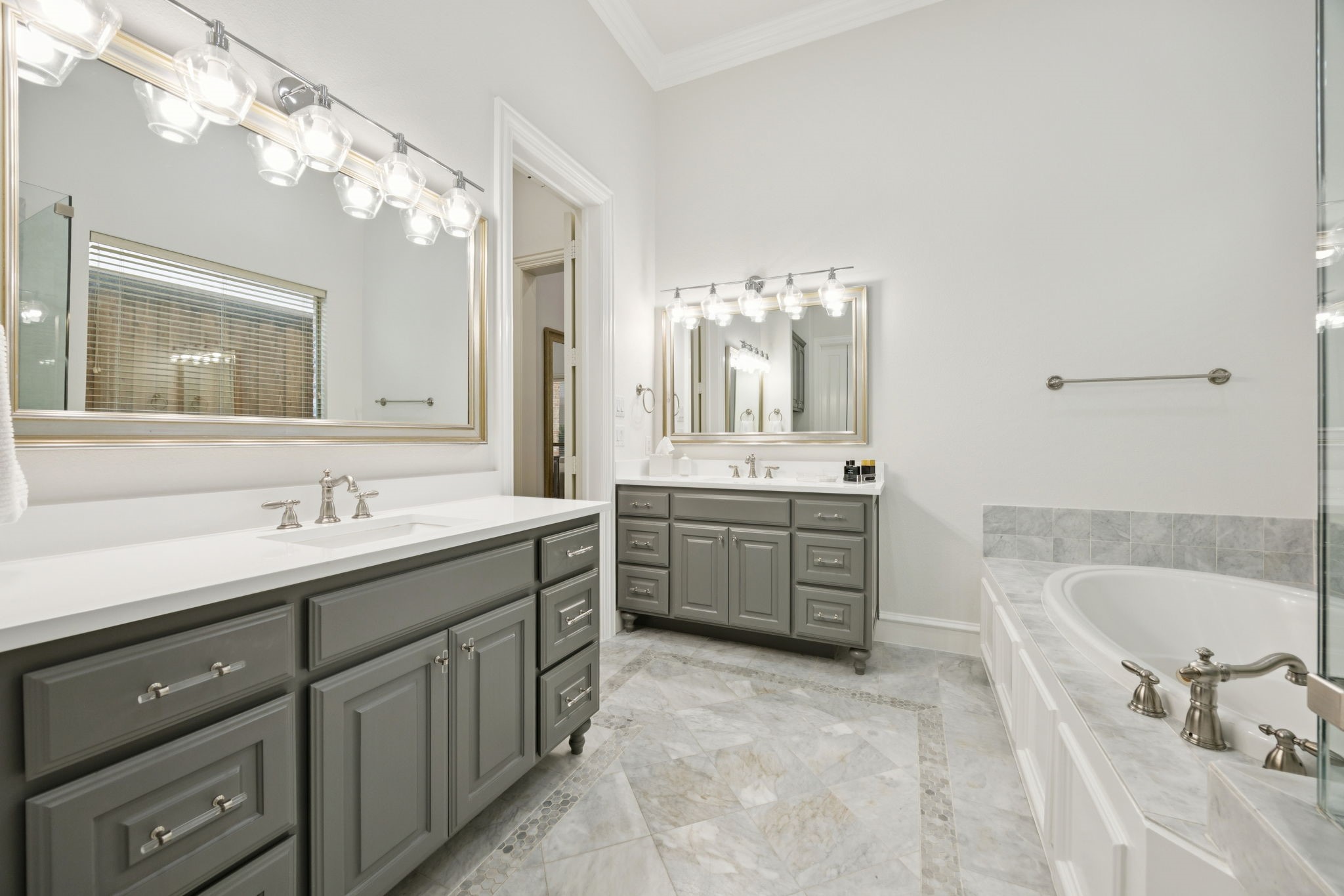 The first floor primary suite offers a serene retreat with a marble bath. Upstairs, you will find three recently updated generously sized ensuite bedrooms, a media room, and a wide central hallway ideal for a study nook or snack station, and a large media game room flex space.